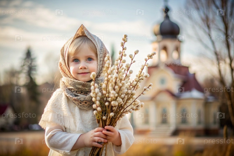 Пальмовое воскресенье. христианство. портрет трехлетней девочки в русском народном шале с ветвями ивы в руках на фоне православной церкви