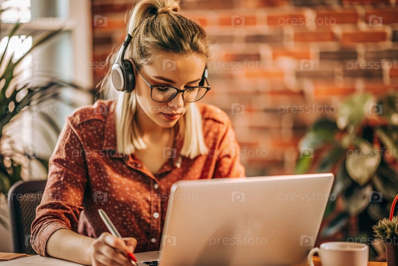 Молодая женщина фрилансер в очках и наушниках работает на ноутбуке или делает покупки в интернет-магазине