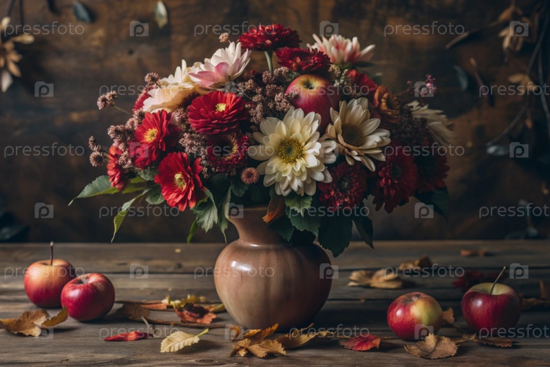 Красочное лето, осенний букет цветов различных красных, розовых, белых оттенков в вазе и спелые красные яблоки на столе