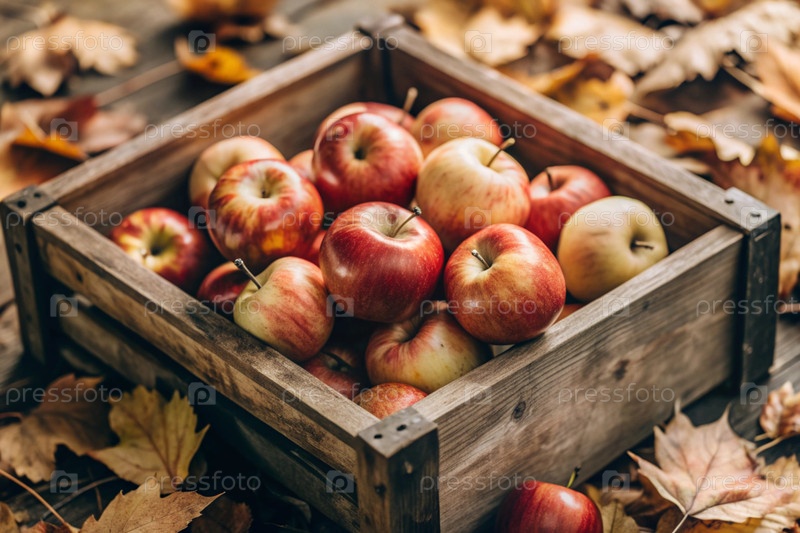 Деревянная коробка, наполненная свежими фруктами. Корзина с красными яблоками. Красивое солнечное сияние. Осенний урожай