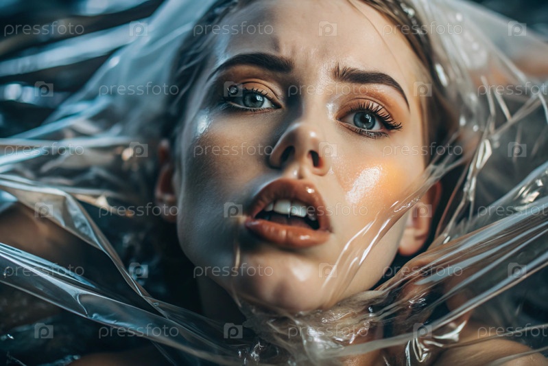 Девочка завернута в целлофан или сумку. Девушка задыхается. Пластиковое загрязнение планеты. Опасность для окружающей среды. Сокращение повторного использования пластика. Переработка. Концепция мусора