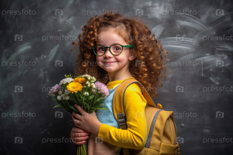 рыжеволосая скандинавская девочка со своими очками у доски. девушка держит цветы в руках. это ее первый раз, когда она ходит в школу. ребенок с рюкзаком, книгой и цветами. обратно в школу