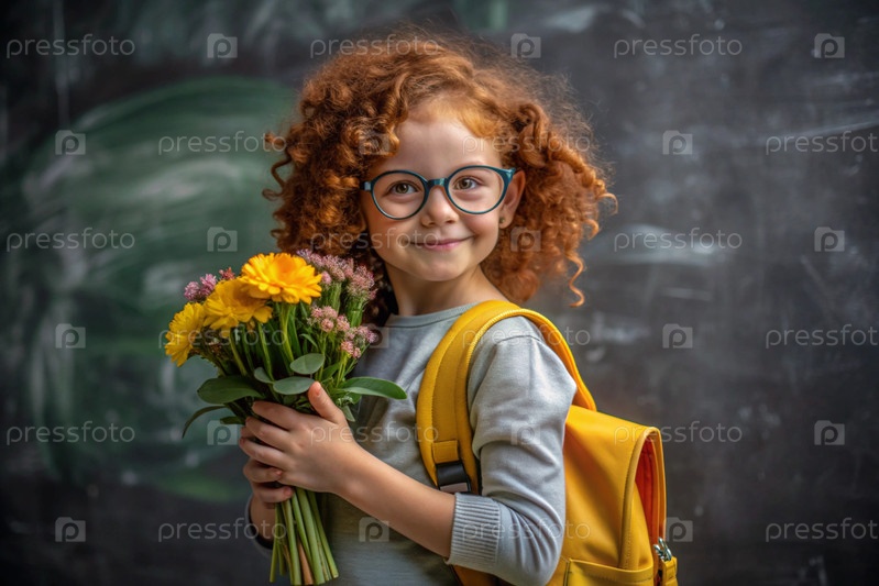 рыжеволосая скандинавская девочка со своими очками у доски. девушка держит цветы в руках. это ее первый раз, когда она ходит в школу. ребенок с рюкзаком, книгой и цветами. обратно в школу
