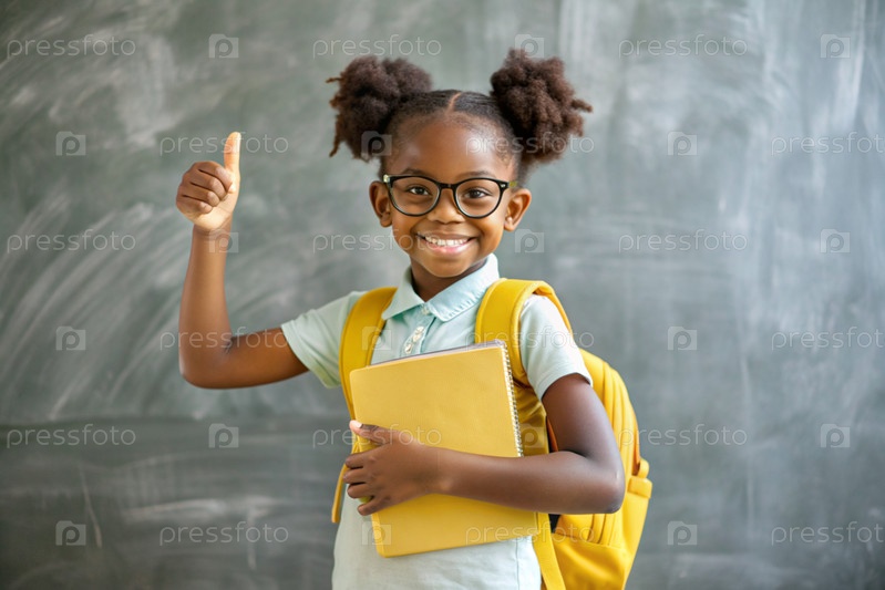 Милая чернокожая афроамериканка с очками показывает класс рукой. Ребенок впервые идет в школу. Ребёнок со школьной сумкой и книгой. Ребёнок в классе с доской. Возвращение к школе