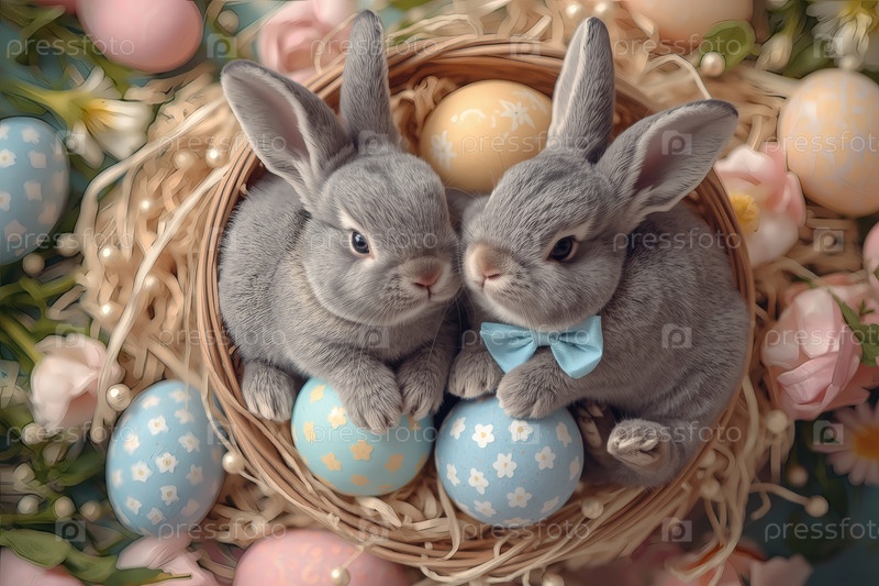 Пасхальные кролики лежат на пасхальных яйцах и смотрят в камеру