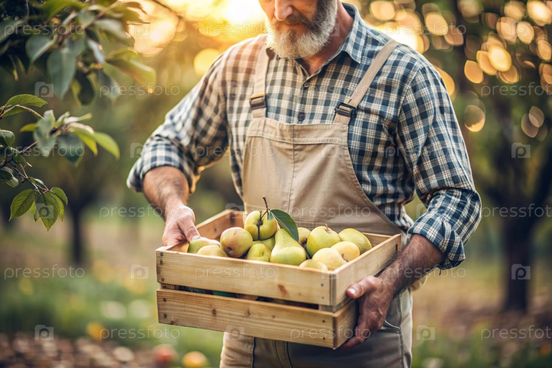 Сельскохозяйственная промышленность. Деревянный ящик с грушами в руках фермера-мужчины. Садовник собирает богатый урожай. Ближе, солнечный свет. Осенний сбор фруктов и овощей