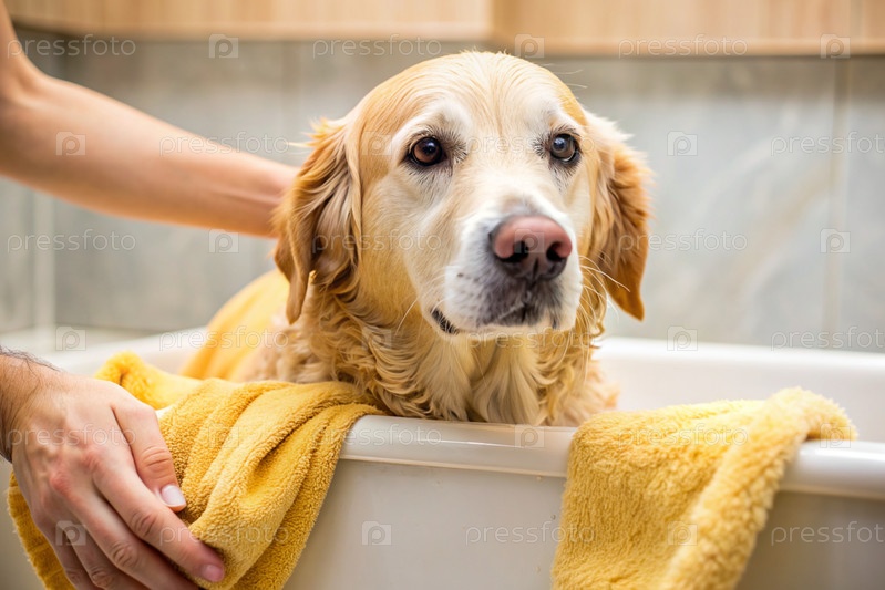Золотой ретривер купается в пузырьковой ванне. Помыть собаку. Концепция ухода за домашними животными