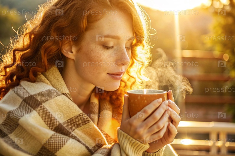 Красивая рыжеволосая женщина, завернутая в клетку с кружкой горячего кофе на красивом террасе под лучами заходящего солнца