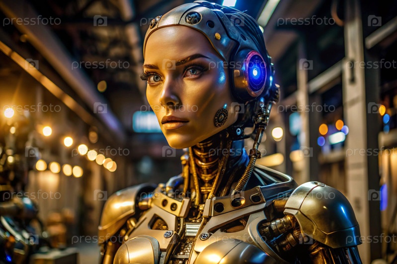 Женский робот-киборг. Интеграция технологий и человеческого взаимодействия. Производство роботов. Искусственный интеллект, Интернет и цифровые технологии будущего