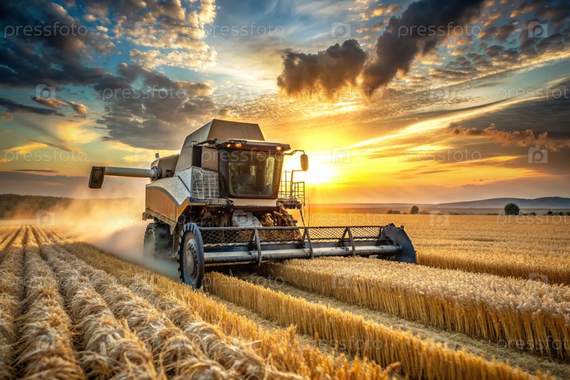 Сельскохозяйственная промышленность и машиностроение. комбинированный комбайн удаляет золотые колоски спелой пшеницы на фоне созревающего поля. Концепция посадки и сбора урожая богатый урожай