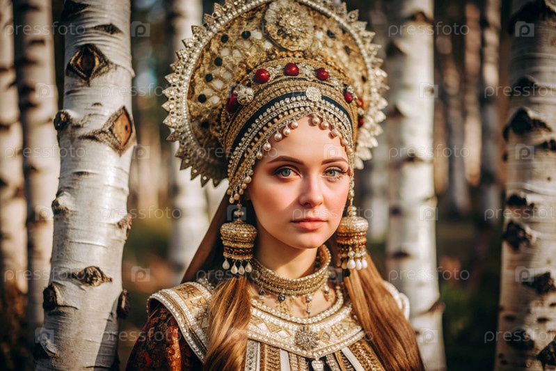 Красивая девушка в традиционном русском национальном костюме.Перед березовым ростом.Портрет символизирует традиции и красоту русского народа