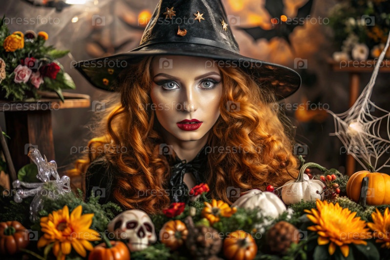 Концепция Хэллоуина. Ужасное. Костюмированная вечеринка. Красивая женщина в костюме ведьмы. Баннер, открытка