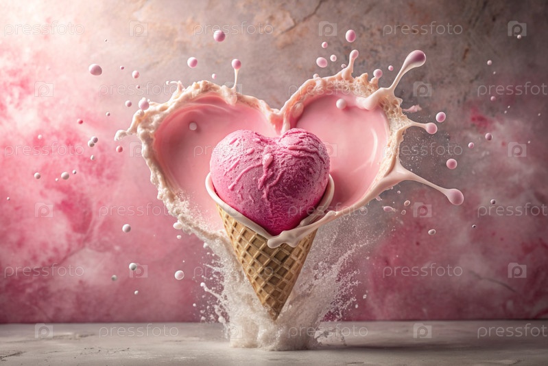 Сладкий десерт. Любовь к мороженому. Сердечно-образный конус мороженого с брызгами, сердцами и пятнами. Концепция Дня святого Валентина. Баннер, реклама
