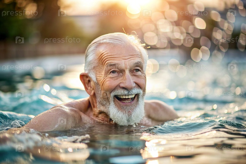 Пожилой мужчина плавает и занимается водной аэробикой в отопительном бассейне, счастливый и улыбающийся пенсионер