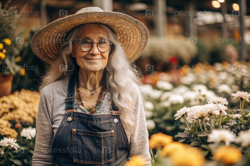 Пожилой садовник с седыми волосами в комбинезоне в уютной цветочной теплице