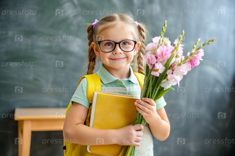 Красивая первоклассница с очками и коньими хвостами на голове. Букет осенних цветов. Ребенок впервые идет в школу. Ребёнок с рюкзаком, книгой и цветами. Возвращение в школу
