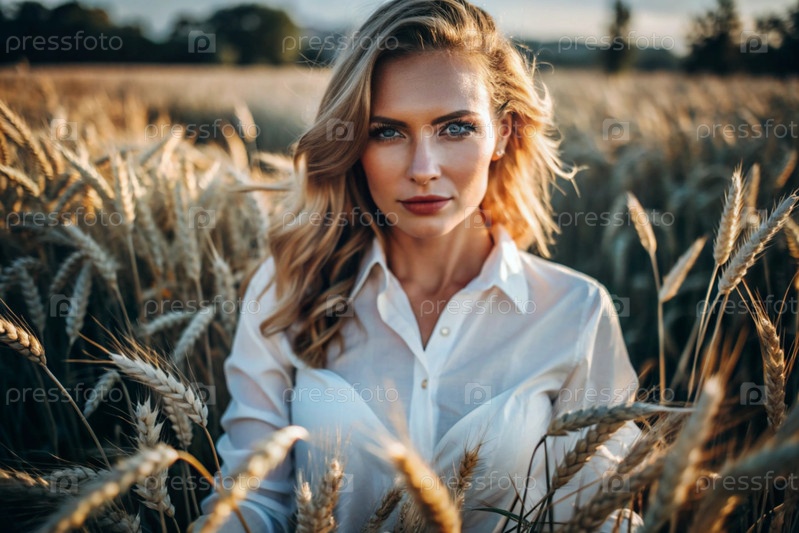 Молодая девушка в белой рубашке с золотыми волосами стоит на поле спелой золотистой пшеницы при закате солнца.Урожай, сельская природа и жизнь