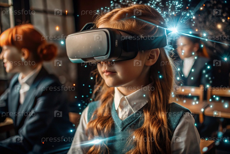 Девочка с очками виртуальной реальности. Ребенок находится в классе, а другие ученики на заднем плане. Цифровой интерфейс отображается в наушниках