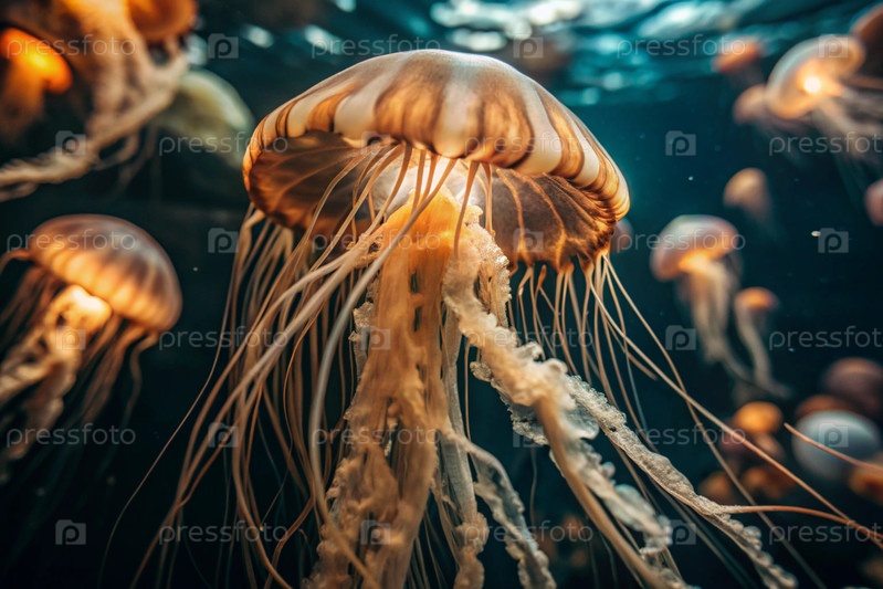 Скуба дайвинг. Дайвинг. Красочные медузы плавают в тропических водах. Медузы в подводном мире диких животных. Наблюдение за океанической фауной