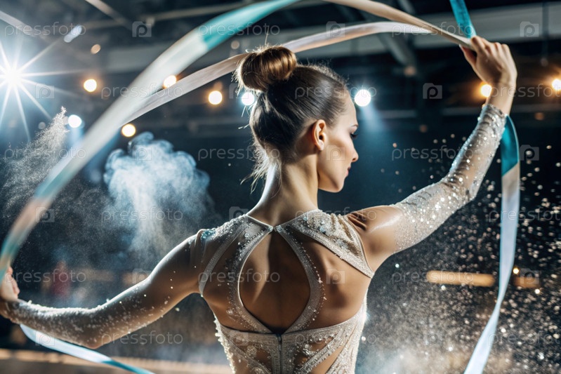 Ритмическая гимнастика - это крупный план красивой гимнастки с лентой в центре внимания на спортивной арене
