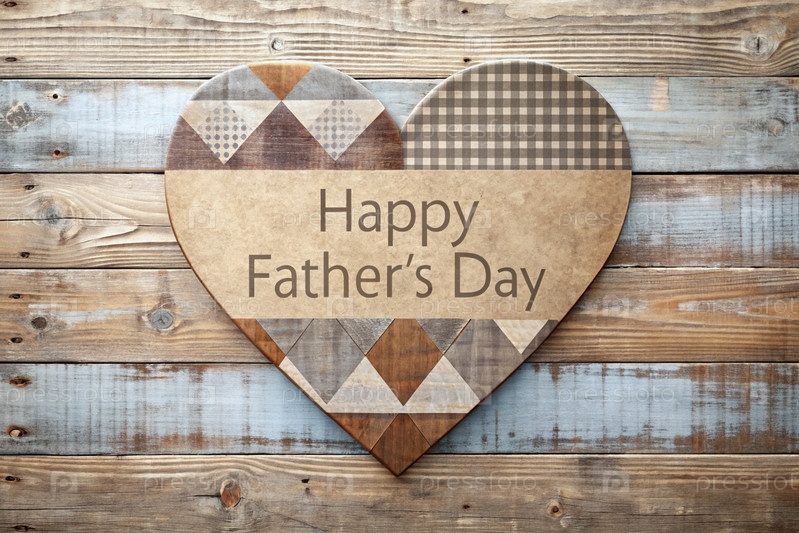 Стильная открытка, баннер на День счастливого отца с деревянным сердцем на винтажном сером, синем и коричневом деревянном фоне