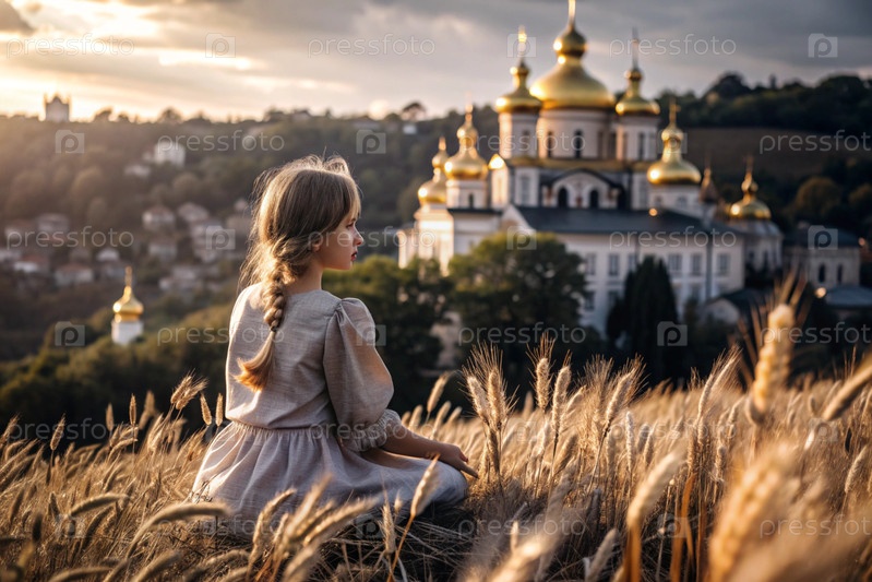 Молодая девушка в льняном платье на фоне поля спелых золотых пшениц и православной церкви при закате солнца