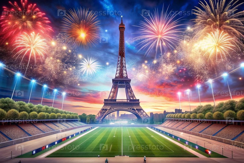 14 июля - Национальный день Франции. Государственный флаг Франции на Эйфелевой башне. Триколор. Концепция Олимпийских игр во Франции 2024