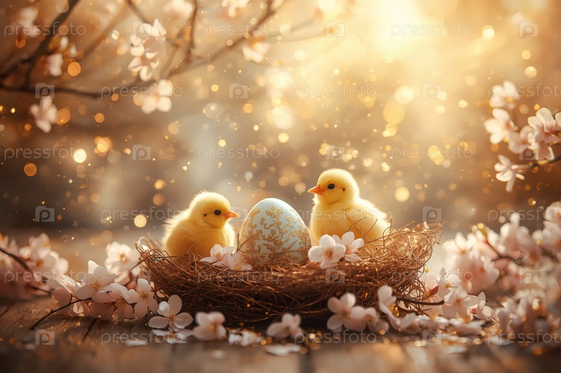 Концепция яркого Пасхального праздника. Нежные розовые пасхальные яйца, желтые курицы и вишневые ветви на деревянном фоне. Концепция ярких пасхальных праздников в 2026 году