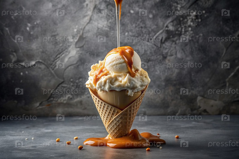 сладкий десерт. мороженое с ароматизированным карамелем. белое ванильное мороженое на фоне серых тонов. карамэль, капающий в мороженом