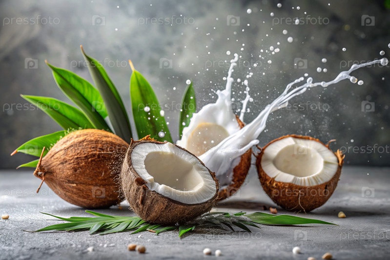 брызги кокосового молока и пальмовых листьев. Брызги молока - кокосы на сером фоне. Баннер для сладостей, курортной косметики или кремов по уходу за телом и лицом