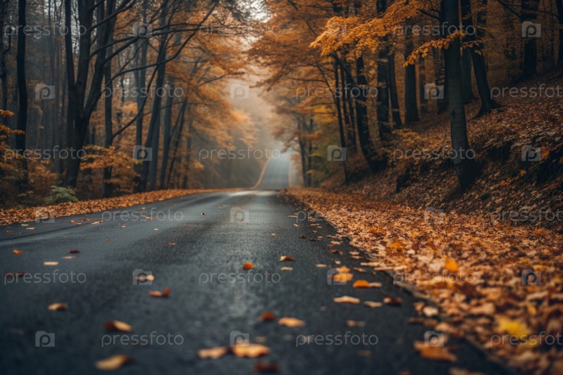 Осенняя поездка. асфальтированная дорога в осеннем лесу с упавшими листьями. осенний фон. селективное фокусирование