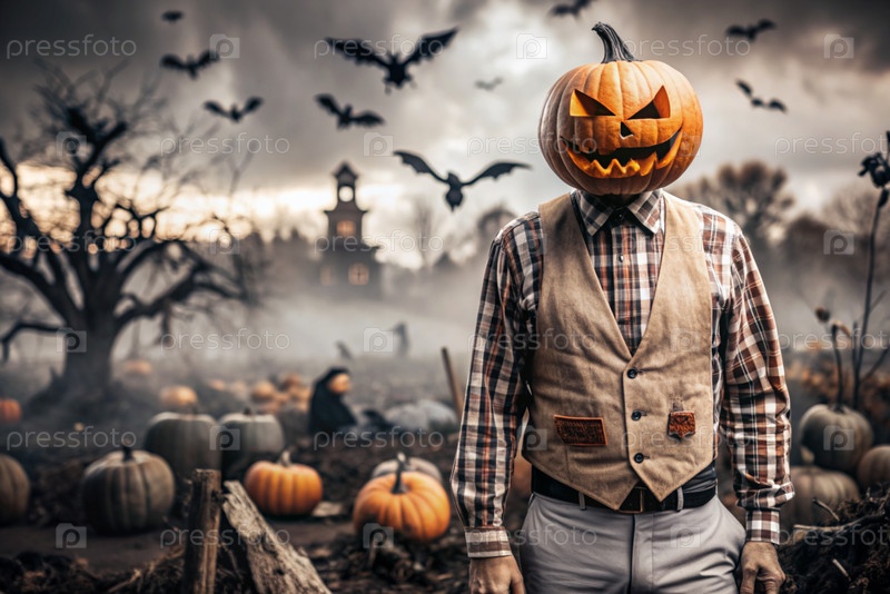 Концепция Хэллоуина. Ужасная. Страх. Устрашающий богий с тыквенной головой, квадратной рубашкой и бабочкой. Баннер, открытка