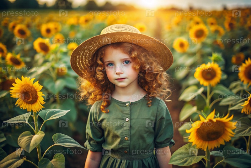 Портрет красивой кудрявой девушки в соломенной шляпе и зеленом платье на цветущем поле подсолнечника Детство