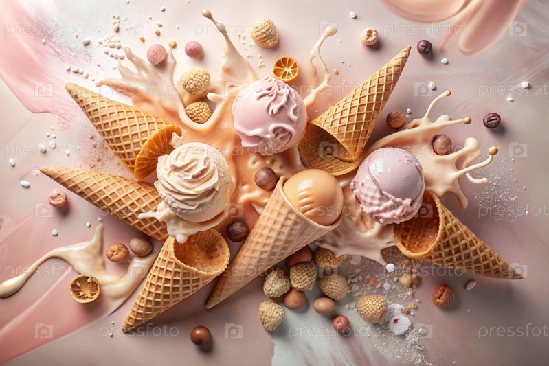 Абстрактная композиция с таяющим мороженым. Плески и брызги мороженого. натюрморт, изображающий перевернутый конус мороженого на светло-розовом фоне