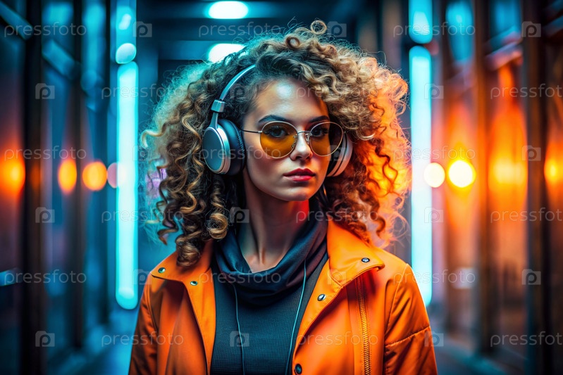 Молодая красивая девушка в солнцезащитных очках слушает музыку на больших беспроводных наушниках, стоя в неонном туннеле среди неоновых вывесок