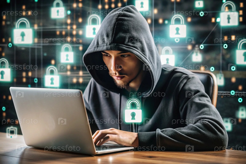 Хакер работает на ноутбуке, цифровые коды на виртуальном фоне. взлом и защита онлайн-данных. цифровые технологии, разработка программного обеспечения