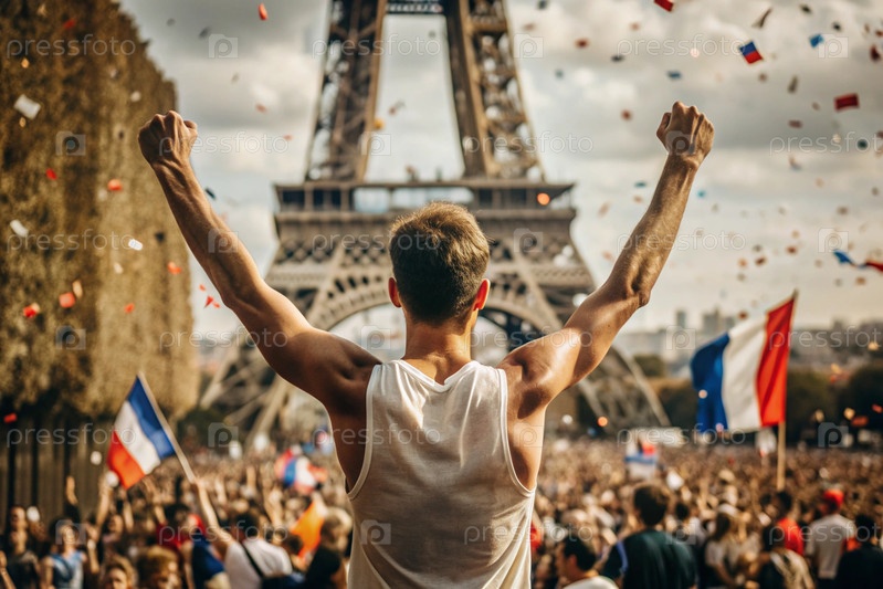 Атлет по легкой атлетике побеждает во время марафона или гонки на фоне Эйфелевой башни на спортивном мероприятии