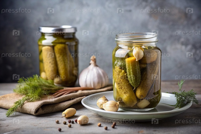 Хрустящие огурцы в прозрачной стеклянной банке на столе, покрытые льняным скатертьем. цельнозеленые маленькие огурчики с укропом и чесноком. вкусные овощи из консервов. мы закрываем огурцы для зимы