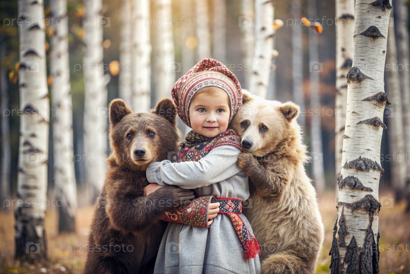 Красивая маленькая девочка в русской народной одежде и с платками на голове в березовой роще с живым медведем Русский фольклор, славянская мифология