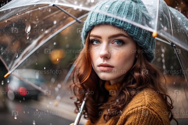 Осенний портрет под дождем. Близкий план молодой рыжеволосой женщины с ярко выраженными зелеными глазами в вязанной шляпе под зонтиком