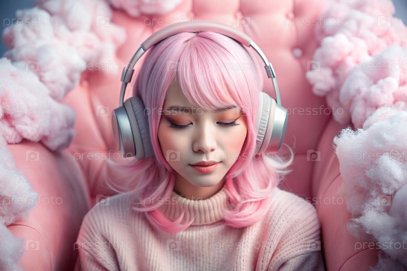 Молодая красивая японская девушка с розовыми волосами в аниме слушает музыку на беспроводных наушниках в розовых облаках