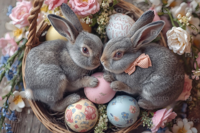 Пасхальные кролики лежат на пасхальных яйцах и смотрят в камеру