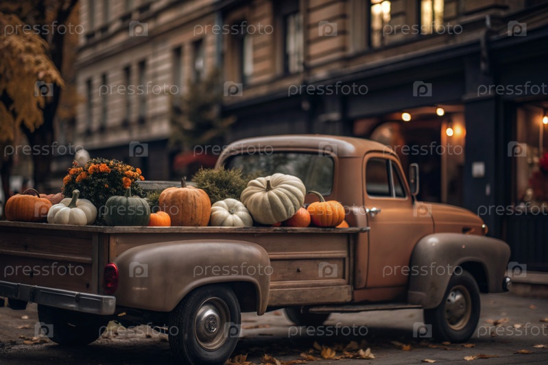 Осень, осенний дизайн.Большой урожай тыквы на заднем сиденье ретро-пикапа, крупный план