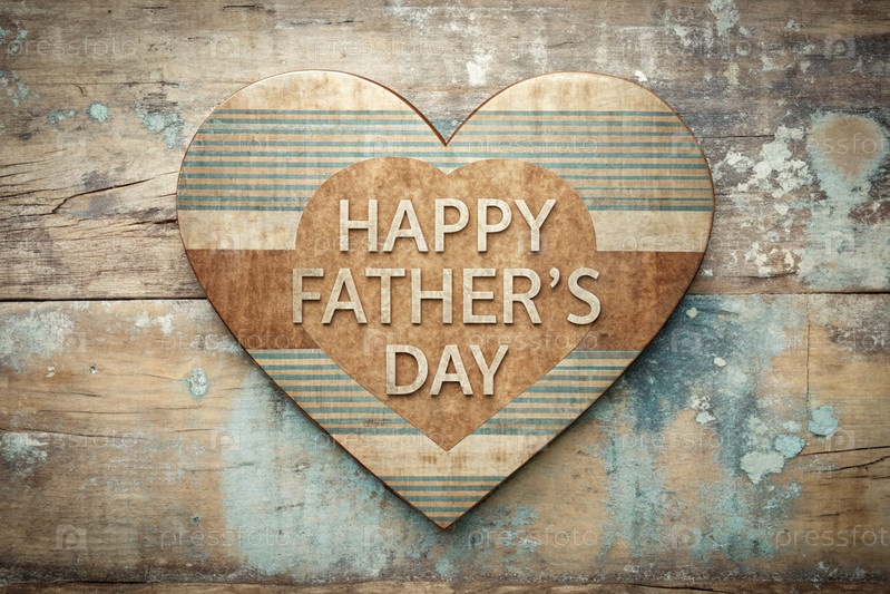 Стильная открытка, баннер на День счастливого отца с деревянным сердцем на винтажном сером, синем и коричневом деревянном фоне