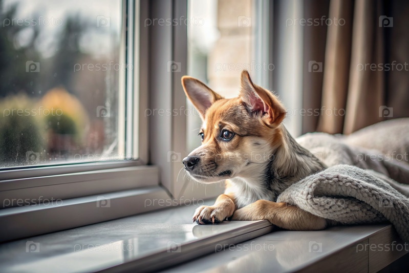 Маленький щеночек смотрит в окно и ждет своего хозяина