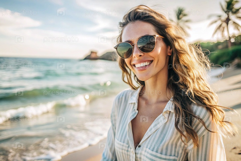 Красивая девушка в белой хлопковой рубашке и солнцезащитных очках на океане на фоне пальмовых деревьев. она улыбается и смотрит в камеру. летние каникулы и праздники