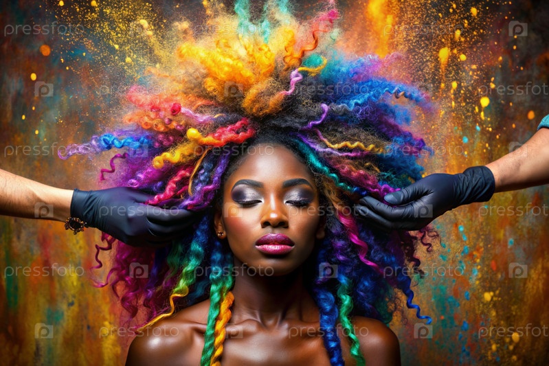 Творческий баннер для салона красоты или парикмахера. Модное профессиональное окрашивание волос. Красивая чернокожая афроамериканка с длинными многоцветными волосами. Взрыв цветов на голове