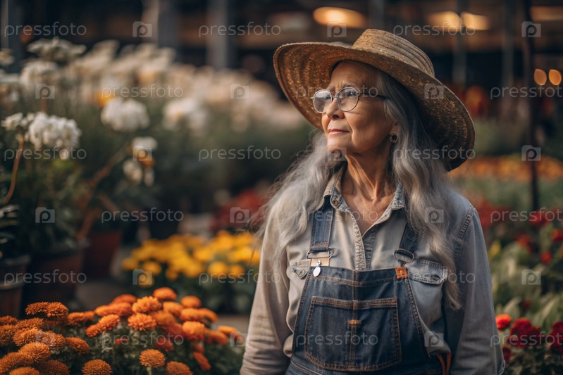 Пожилой садовник с седыми волосами в комбинезоне в уютной цветочной теплице