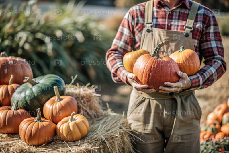 Руки мужчины в квадратной рубашке с тыквенным крупным планом и красивым осенним рисунком. Сбор тыков. Концепция празднования Дня благодарения и Хэллоуина