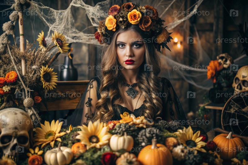 Концепция Хэллоуина. Ужасное. Костюмированная вечеринка. Красивая женщина в костюме ведьмы. Баннер, открытка